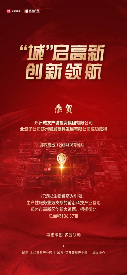 9月29日,鄭州城發(fā)產城投資集團有限公司全資子公司鄭州城發(fā)高科發(fā)展有限公司成功競得鄭政高出〔2024〕8號地塊,該地塊位于鄭州市高新區(qū)創(chuàng)新大道西側、梧桐街北側,為一類工業(yè)用地(小微企業(yè)園用地),總面積136.37畝。