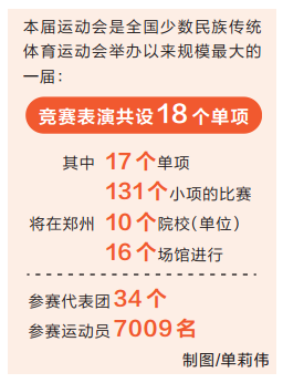 據(jù)競賽表演部相關(guān)負(fù)責(zé)人介紹,本屆民族運(yùn)動(dòng)會(huì)競賽表演共設(shè)18個(gè)單項(xiàng),馬上項(xiàng)目比賽已于7月12日至17日在呼和浩特圓滿結(jié)束,其他17個(gè)單項(xiàng),131個(gè)小項(xiàng)的比賽將在鄭州10個(gè)院校(單位)、16個(gè)場館進(jìn)行;參賽代表團(tuán)34個(gè),參賽運(yùn)動(dòng)員7009名,是全國少數(shù)民族傳統(tǒng)體育運(yùn)動(dòng)會(huì)舉辦以來規(guī)模最大的一屆。另外,本屆運(yùn)動(dòng)會(huì)還將突出河南省武術(shù)大省的優(yōu)勢,“少林拳”和“陳氏太極拳”等也將一一呈現(xiàn)。