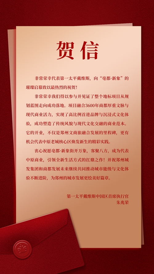 “亳都·新象”由城發(fā)集團(tuán)投資建設(shè),項(xiàng)目的成功開街,不僅是商業(yè)運(yùn)營的勝利,更是城市文化與商業(yè)融合發(fā)展的典范。第一太平戴維斯中國區(qū)首席執(zhí)行官朱兆榮在賀詞中表示,“亳都·新象的開業(yè),不僅是鄭州文商旅融合發(fā)展的里程碑,更有機(jī)會(huì)代表中原老城核心區(qū)煥發(fā)新生的精彩實(shí)踐。”