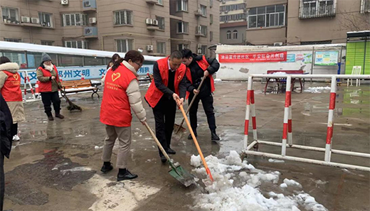 昨晚,鄭州市迎來了牛年第一場雪,小區活動場地已披上一層皚皚白雪,為方便小區居民通行,志愿者們拿著鐵鍬、掃把清理廣場上的積雪,經過大家的努力,積雪被清理干凈。
